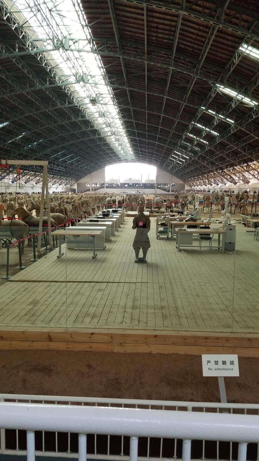 The Terracotta army is quite astounding when you enter the first pit. This one is dedicated to depicting the standard Qin army formation. Essentially, you have a rectangle formation, with archers stationed at the front, followed by lines of infantry, and then chariots manned by officers and generals sprinkled about. The amount of soldiers excavated total about 6,000 spanning an area of around 14,000 square meters, which translates to, as one tour guide said, the width of 1 and a half football fields. Now I’m not sure if she was referring to American football or European football but based on what I could glean from their accents it seemed that they were from the States. In any case, the area was quite large, and although the front appeared well maintained, the back of the pit was reserved for repairs and refurbishment of the soldiers that were broken during the excavation.